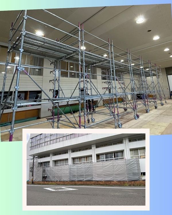 某高校の空調工事に伴い外部足場と剣道場・卓球場に床を傷付けないようコンパネを敷いてローリング足場を設置しました👷♂️